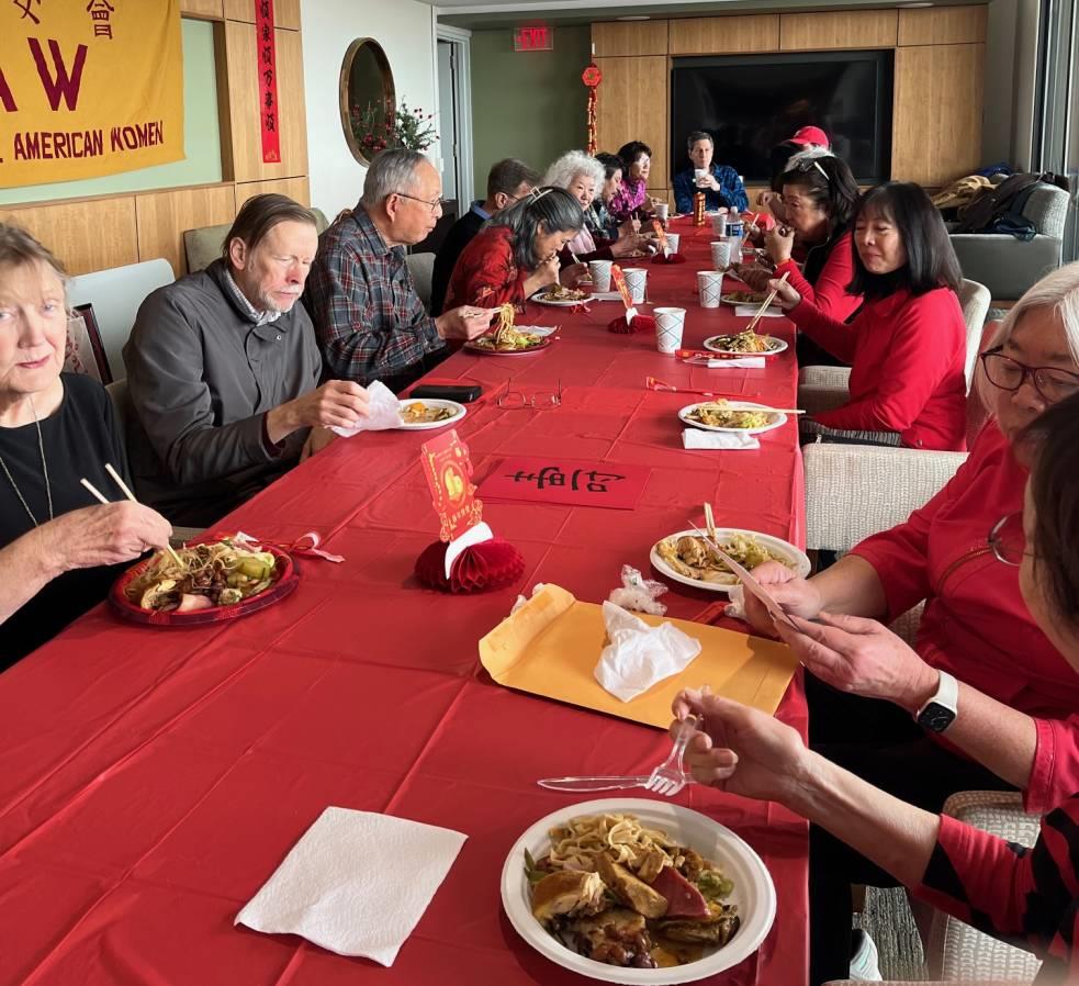 The highlight was a tribute and cake to honor the 100th birthday of C.L. Kwok, husband of longtime member Florence Kwok. After that, somehow we still found room for cookies and more cookies, fruit-nut candies and mandarin oranges. And then we were sent home with longevity buns, as well as blessed longevity artwork created by National Membership Vice President Cathy Roberts.